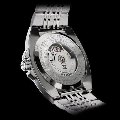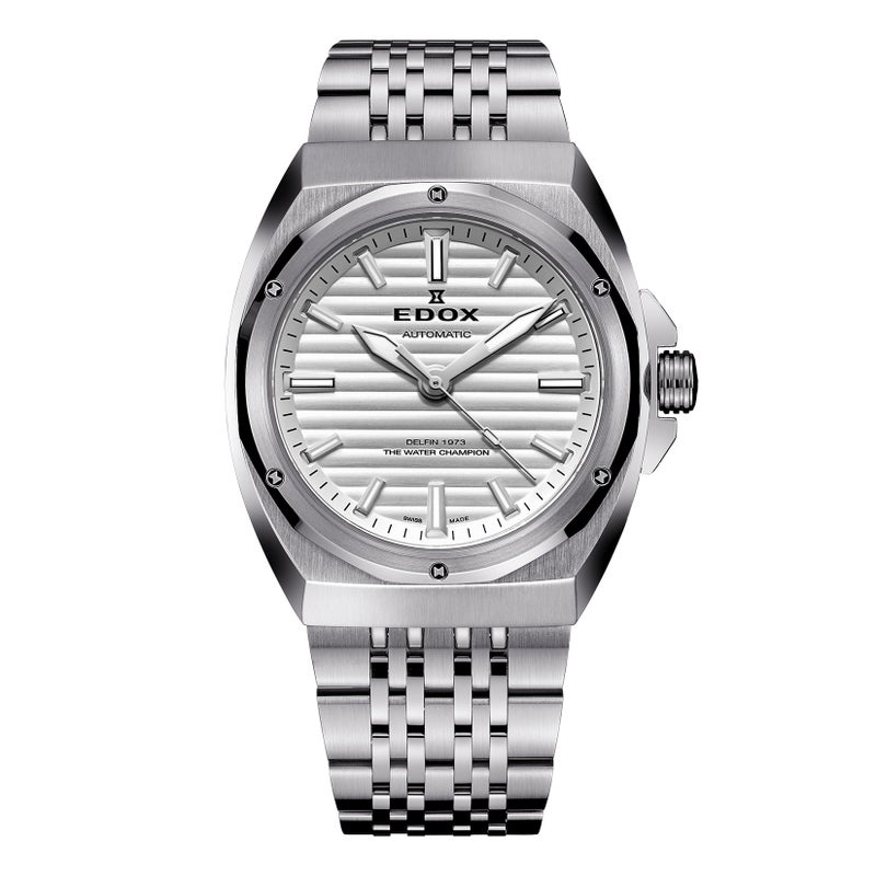 1961年にエドックス旋風を巻き起こした画期的防水時計「デルフィン」。 1973 年のデルフィンに初採用された12角形ベゼルを起点に、1970 年代のモデルに見られるケースデザインの流れを汲みながら構築されたモデル