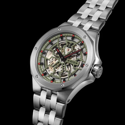 ブランドのエンブレムである砂時計をモチーフに、美しいカットワークを施したモダンスケルトン。内部機構である“テンプ・ガンギ車・アンクル・香箱・日の裏車”など、精巧なムーブメントの動きを目で見て楽しむことできます。特注で製作された斜めカットのインデックスは、文字盤全体を立体的かつバランス良く見せます。また、完全なシースルー仕様にしないことで、時計着用時に肌が透けて見えないようデザイン設計されていることも魅力の一つです。