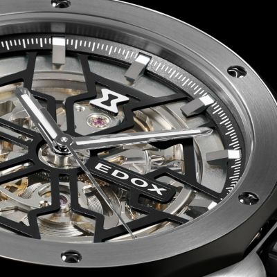 - ブランドのエンブレムである砂時計をモチーフに、美しいカットワークを施したモダンスケルトン。内部機構である“テンプ・ガンギ車・アンクル・香箱・日の裏車”など、精巧なムーブメントの動きを目で見て楽しむことできます。特注で製作された斜めカットのインデックスは、文字盤全体を立体的かつバランス良く見せます。また、完全なシースルー仕様にしないことで、時計着用時に肌が透けて見えないようデザイン設計されていることも魅力の一つです。