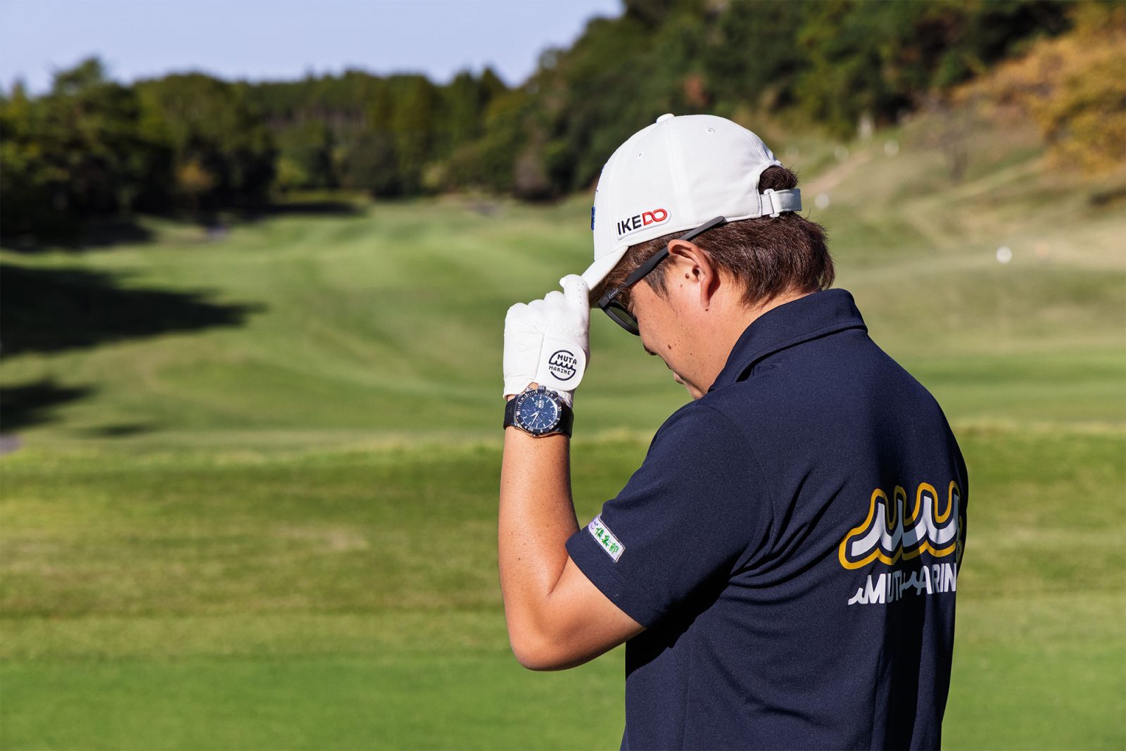 もし今後エドックスからゴルフ対応の高級機械式腕時計がリリースされることがあれば、是非着けてプレイしてみたいですね。優勝争いのパッティングで手元が映ったとき、エドックスの腕時計を着けていたらかっこいいですね(笑)。今回スポンサーのムータさんが僕のために作ってくれたキャップにも、ダイヤルと同じブルーカラーが使われているんです。ムータさんはゴルフでも海でも似合うウェアやアイテムを作っているので、まさに、この時計ともマッチします。
