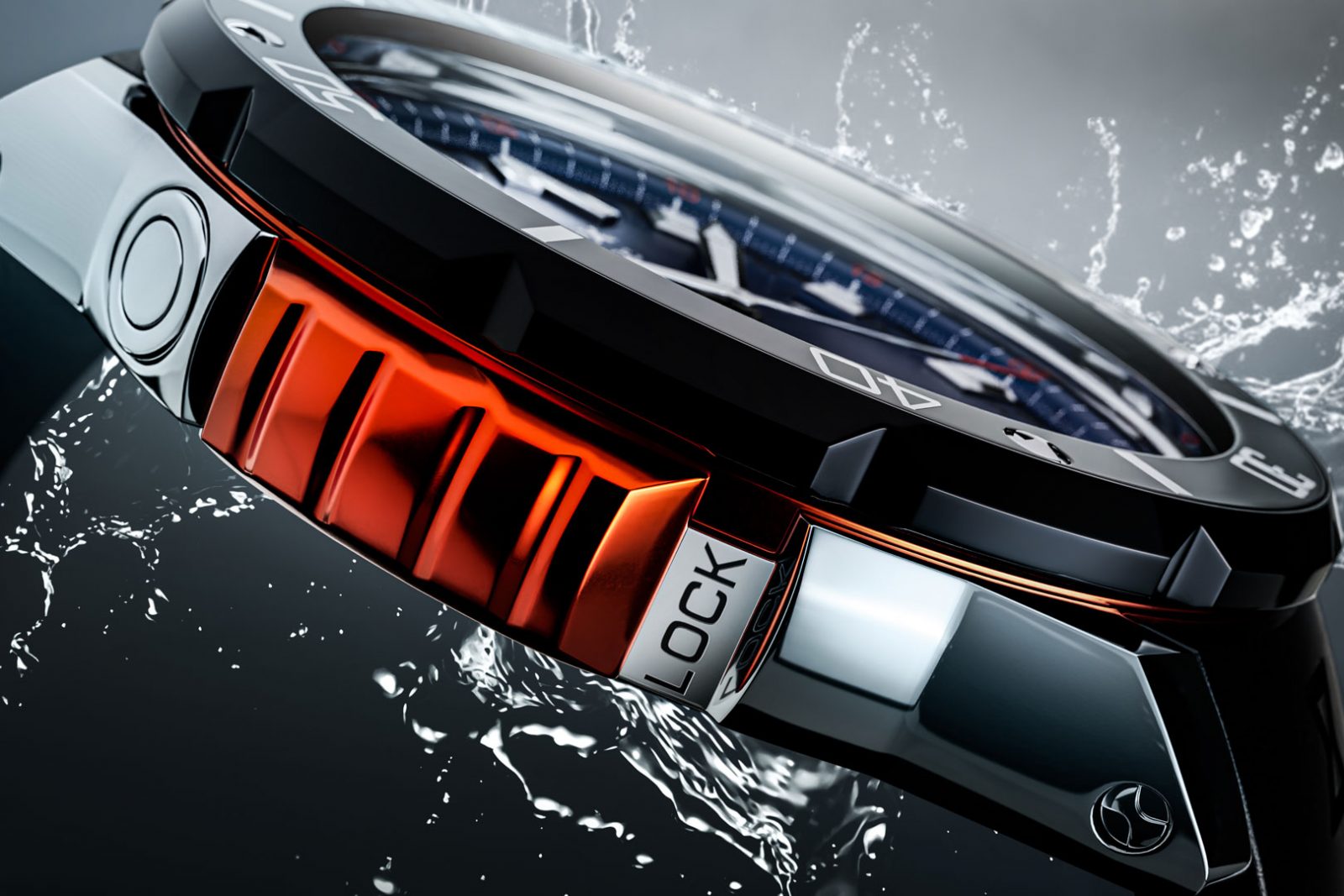 レバーにはモデルごとにレッド、オレンジ、ピンクゴールド、イエローゴールドのカラーを採用。水中での視認性を高めるとともに、スポーティーなアクセントとしても存在感を放ちます。