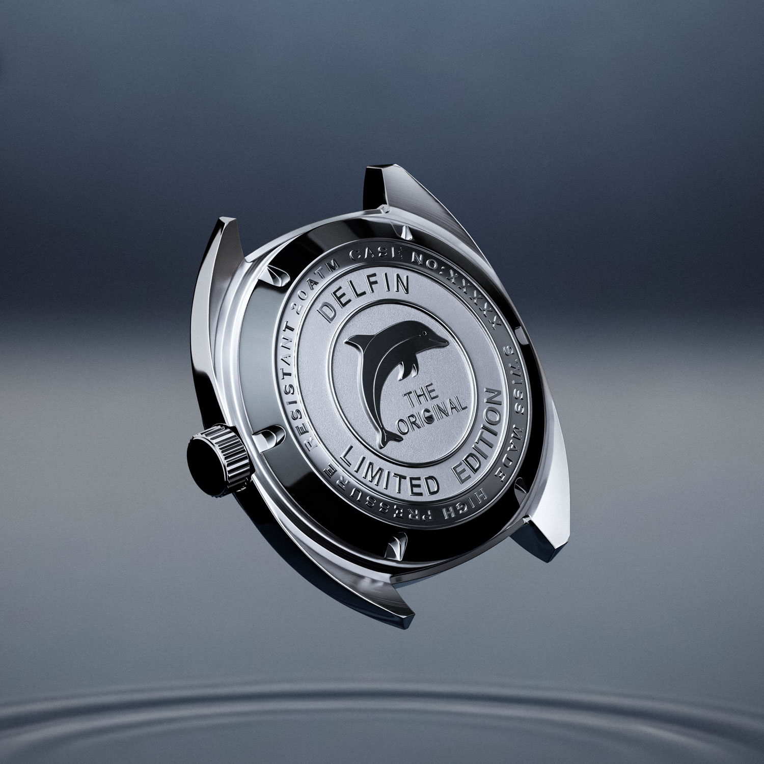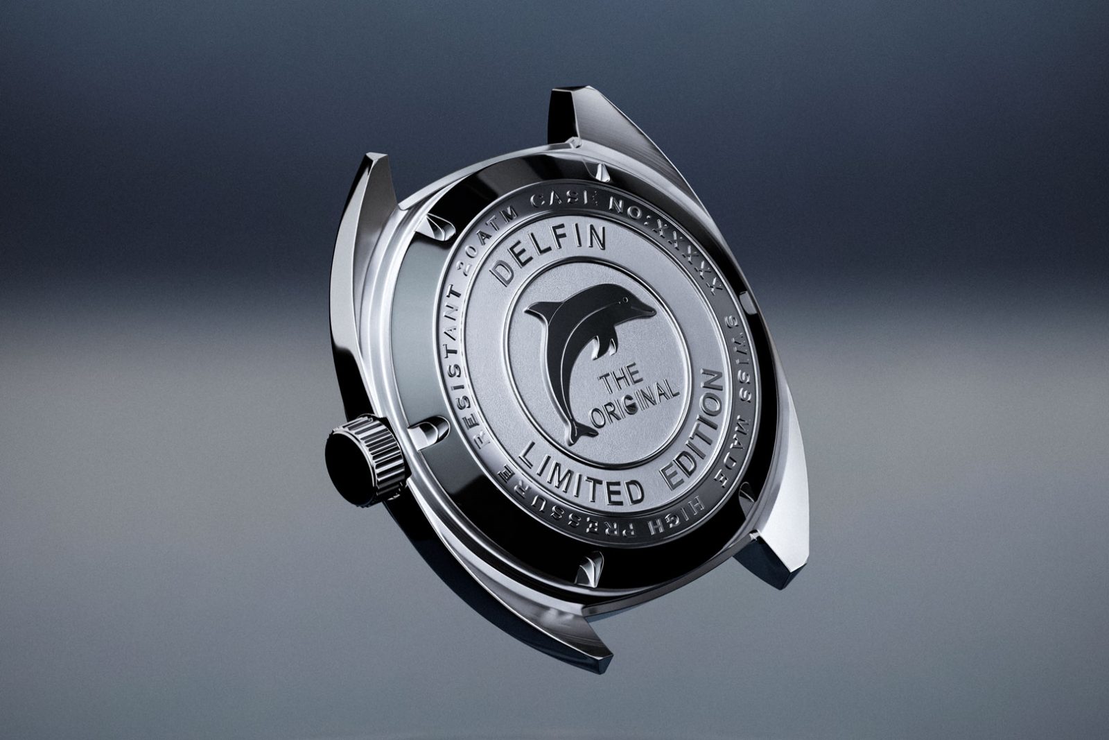 放射仕上げのダイアルは角度によって繊細に表情を変え、静かな存在感を放ちます。さらに、ケースバックにはイルカのモチーフを刻印。デルフィンの名の由来とともに、防水性能への自信と海との結びつきを象徴しています。